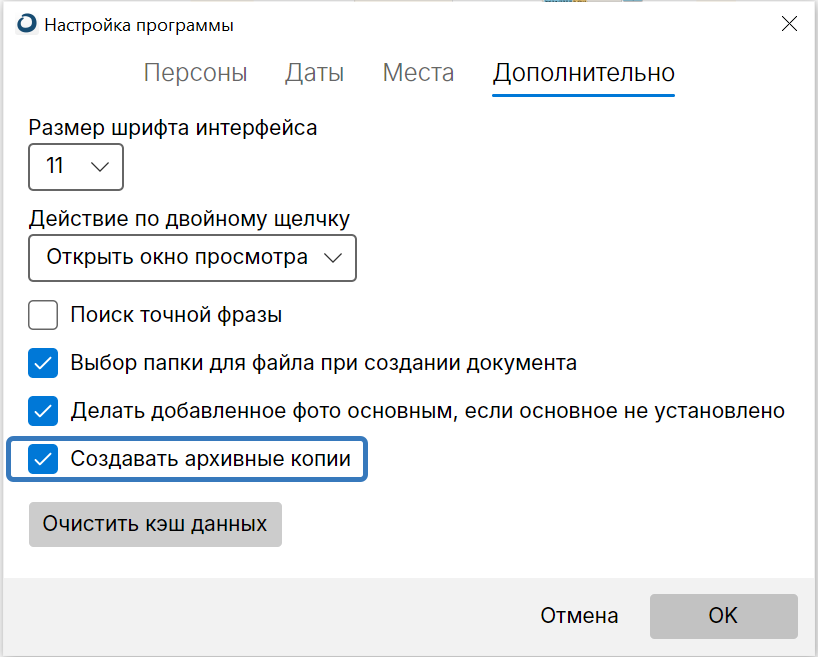 «Древо Жизни» периодически (если прошло более 1 дня с последнего запроса на создание архивной копии И более 30 записей было добавлено/изменено/удалено с момента создания последней архивной копии) предлагает создать архивную копию данных, для этого должна быть включена соответствующая опция в окне настройки программы. В ответ на предложение программы создать резервную копию пользователь может согласиться или отказаться. Мы настоятельно рекомендуем создавать архивные копии данных и сохранять их на отдельном носителе, например, на внешнем диске (флешке), на другом компьютере или в облачном хранилище.