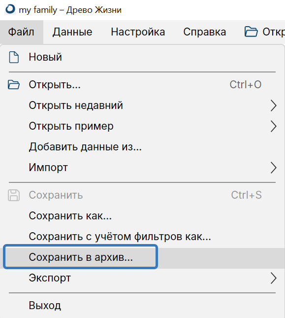 ). Полученный архивный файл нужно перенести на другой компьютер, извлечь данные из архива (например, в папку документов пользователя) и затем открыть извлечённый файл данных в «Древо Жизни».