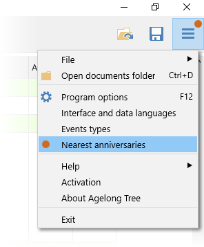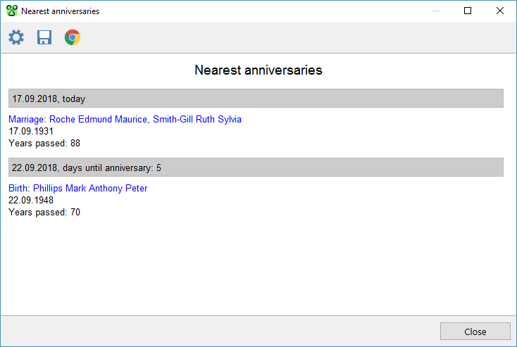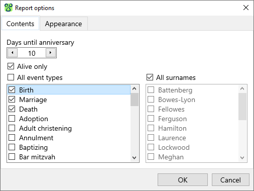 If your family tree is large and you don’t need to see ALL events anniversaries, you can select the types of events and the surnames of the main participants in the events. If events of the type Death are included in the report, the option Alive only is ignored for them.
