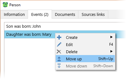 Brothers and sisters are placed in the tree according to the order of events of their birth on the Event tab in the edit window of their parent. If the dates of birth are not specified or are specified approximately, then this order can be changed: