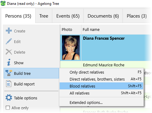 Agelong Tree builds family trees (or genealogical trees) based on information about persons and about the events which unite people into families. A genealogical tree can be constructed for any person selected in the table, this person is called the root of the tree:
